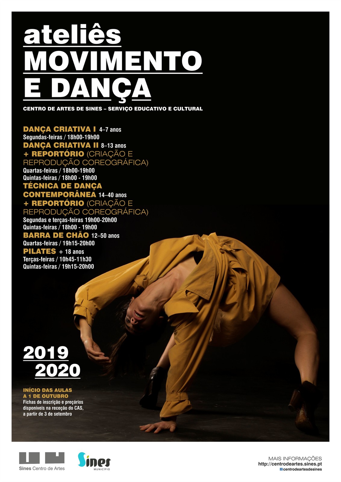 As aulas dos Ateliês de Movimento e Dança do Centro de Artes de Sines, para a época 2019/2020, têm início a 1 de outubro e as fichas de inscrição e preçários estarão disponíveis na receção do Centro de Artes de Sines, a partir do dia 16 de setembro.