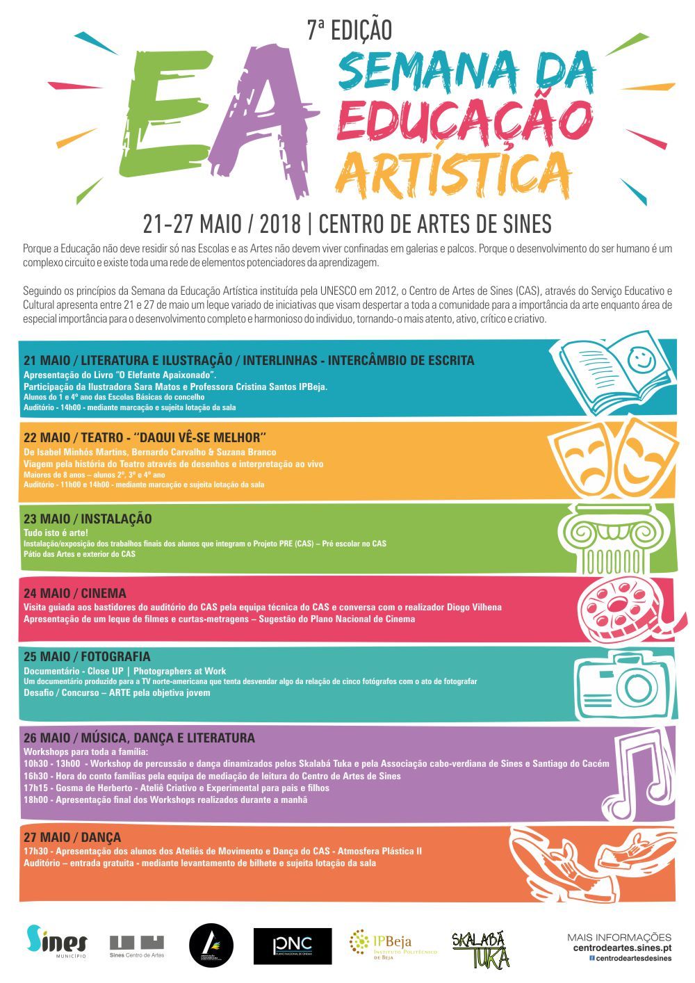 Porque a educação não deve residir só nas escolas e as artes não devem viver confinadas em galerias e palcos, a Câmara Municipal de Sines organiza, de 21 a 27 de maio, no Centro de Artes de Sines, a sétima edição da Semana da Educação Artística.