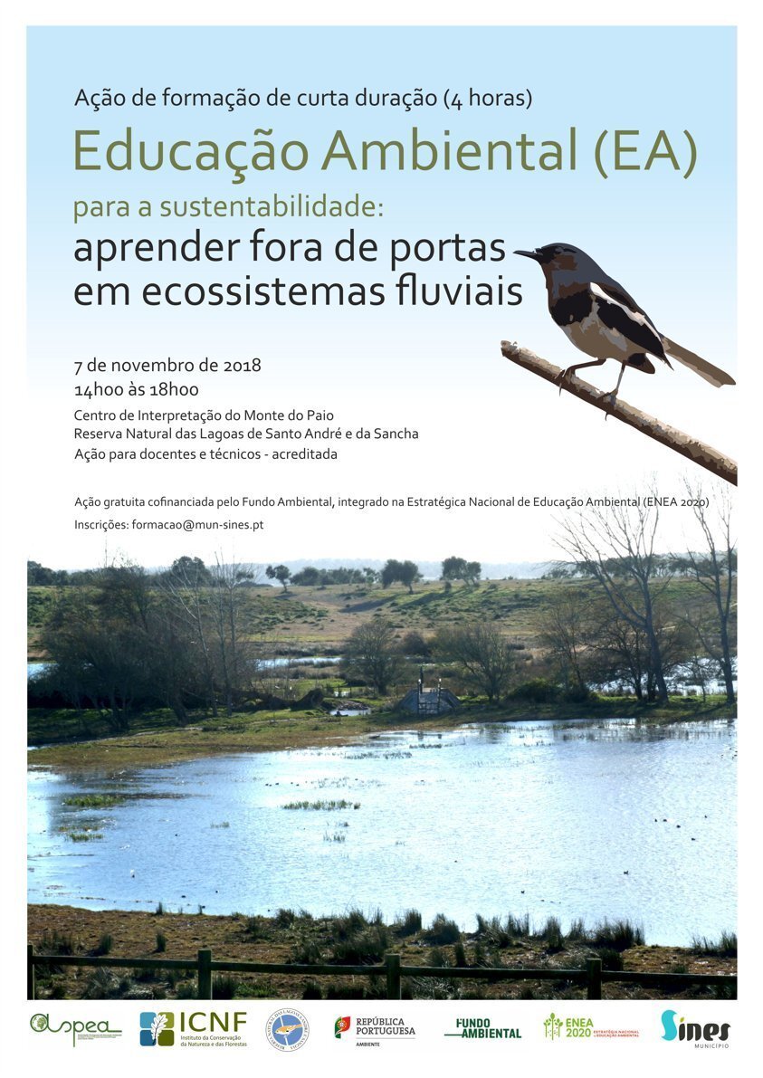 A ASPEA - Associação Portuguesa de Educação Ambiental, em parceria com a Câmara Municipal de Sines e o ICNF / Departamento de Conservação da Natureza e Florestas do Alentejo, realiza no dia 7 de novembro a ação de formação de curta duração (4 horas) "Educação Ambiental para a Sustentabilidade: Aprender Fora de Portas em Ecossistemas Fluviais".