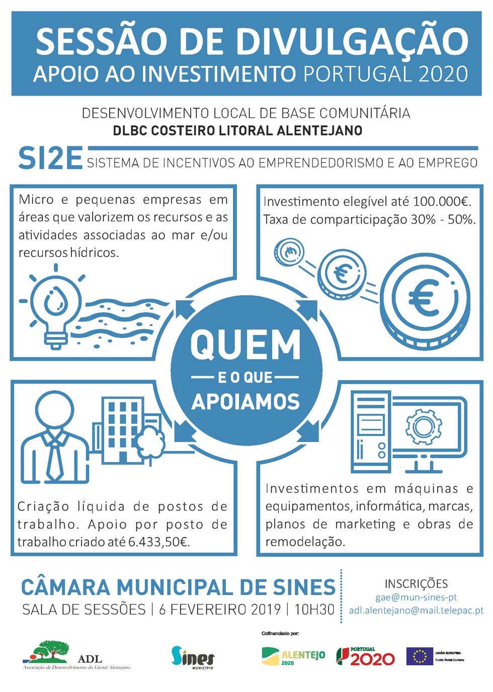 A ADL - Associação de Desenvolvimento do Litoral Alentejano e a Câmara Municipal de Sines promovem, no dia 6 de fevereiro, às 10h30, na sala de sessões da autarquia, uma sessão de divulgação do SI2E - Sistema de Incentivos ao Empreendedorismo e ao Emprego.