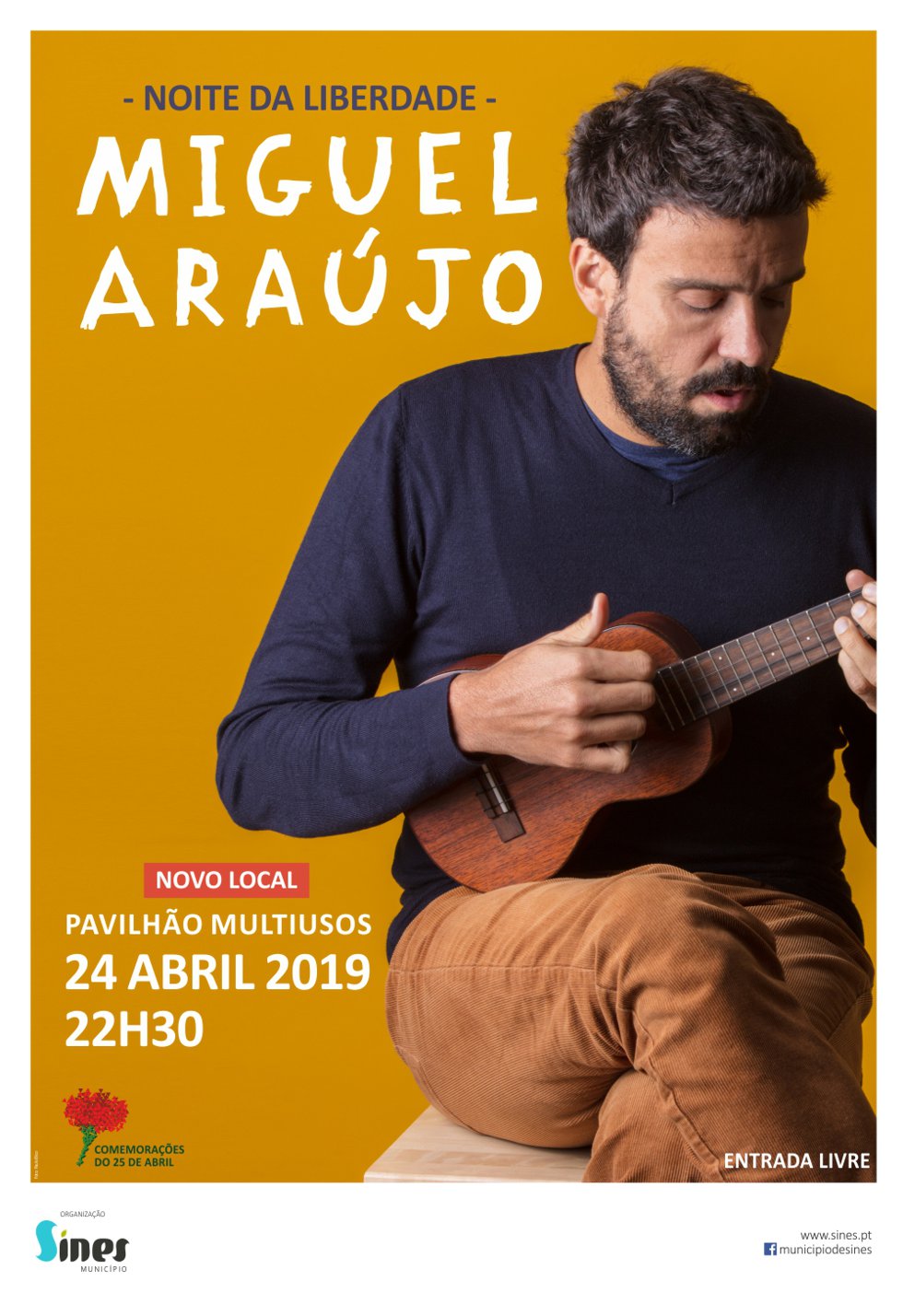 Informamos que, devido à previsão de chuva, o concerto de Miguel Araújo, dia 24 de abril, às 22h30, é transferido do Castelo para o Pavilhão Multiusos de Sines, com entrada livre.