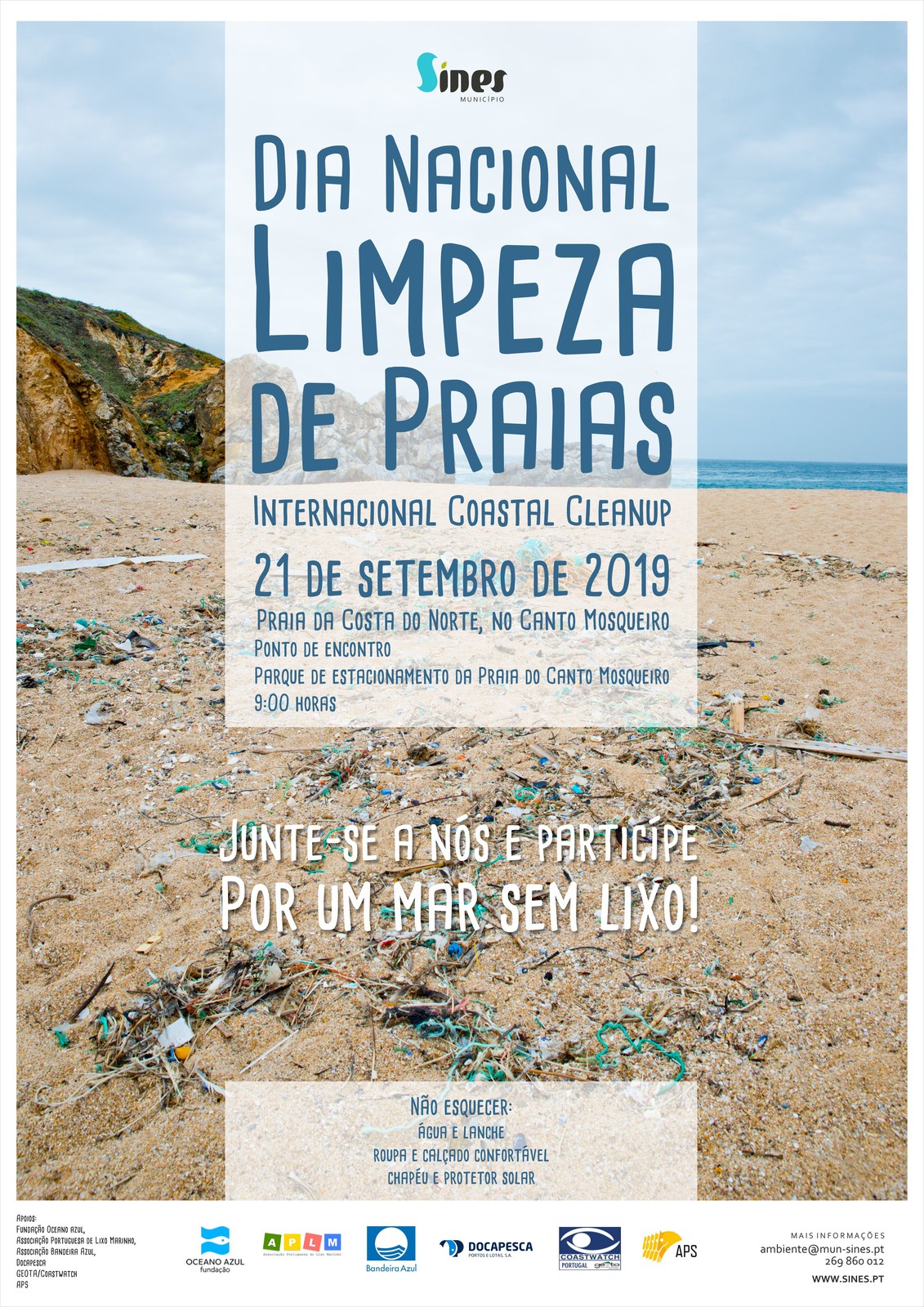 O Dia Nacional de Limpeza de Praia (International Coastal Cleanup), dia 21 de setembro, é assinalado pela Câmara Municipal de Sines, com a 2.ª ação de monitorização e limpeza do areal da praia da Costa do Norte, no Canto Mosqueiro.