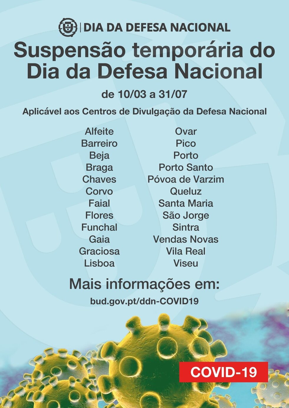 Face à evolução epidemiológica e risco de contágio do novo coronavírus (COVID-19), o Ministério da Defesa Nacional informa que a suspensão preventiva do Dia da Defesa Nacional será prolongada até 31 de julho de 2020.
