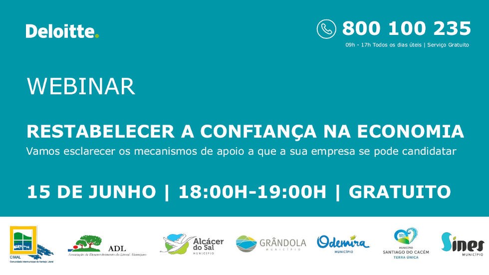 No âmbito do projeto da Linha de Apoio às Empresas do Alentejo Litoral, promovido pela Comunidade Intermunicipal do Alentejo Litoral, realiza-se a 15 de junho às 18h00 o webinar “Restabelecer a confiança na economia”, sobre mecanismos de apoio às empresas.