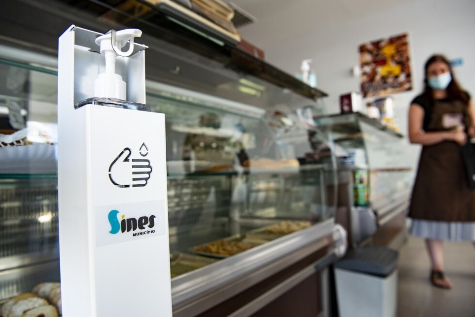 Com efeito, continuam a ser distribuídas máscaras descartáveis, álcool gel e dispensadores de pé de álcool gel pelo comércio das freguesias de Sines e Porto Covo.