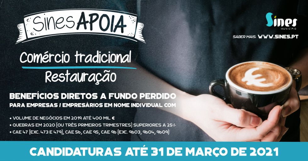 O Município de Sines aprovou, a 24 de fevereiro de 2021, uma alteração às regras do programa "Sines APOIA", para estímulo à recuperação do comércio tradicional e restauração do concelho, destinado às empresas e empresários em nome individual com contabilidade organizada.