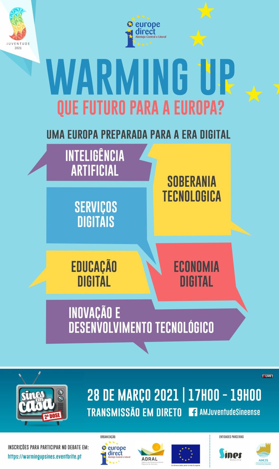 O Centro Europe Direct Alentejo Central e Litoral, com o apoio da Câmara Municipal de Sines e da Associação + para a Juventude Sineense, realiza no próximo dia 28 de março, a partir das 17h00, o evento online Warming Up – Que futuro para a Europa?