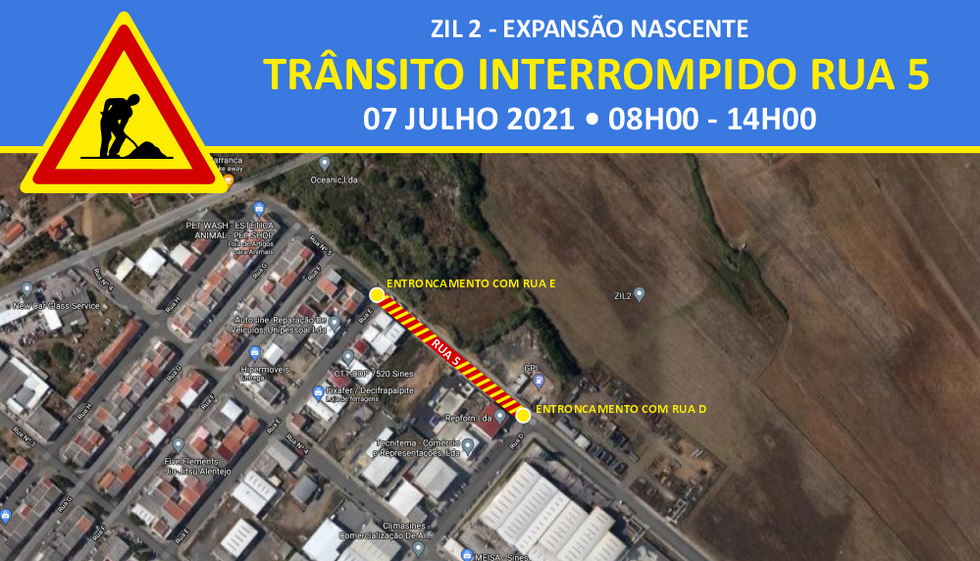 A Câmara Municipal de Sines informa que, devido à execução de trabalhos da empreitada de "Expansão nascente da ZIL 2, em Sines", o trânsito rodoviário estará interrompido na Rua 5 da ZIL 2, entre o entroncamento com a Rua E e o entroncamento com a Rua D.