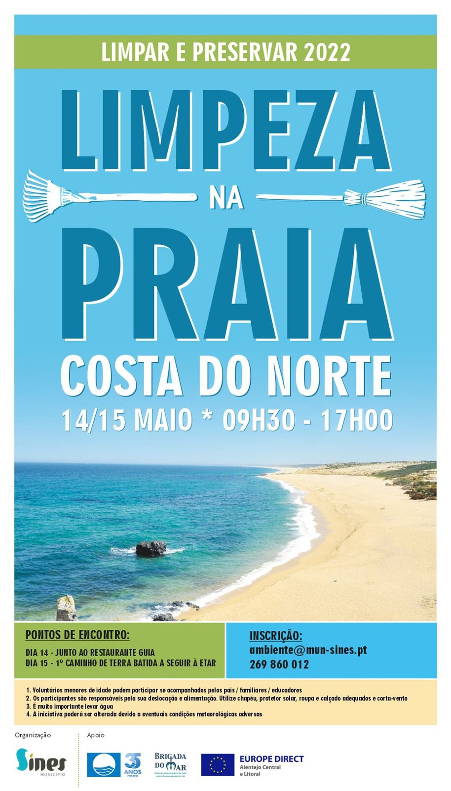 A Câmara Municipal de Sines, com o apoio da Brigada do Mar, promove, a 14 e 15 de maio, a ação de limpeza da praia da Costa do Norte "Limpar e Preservar".