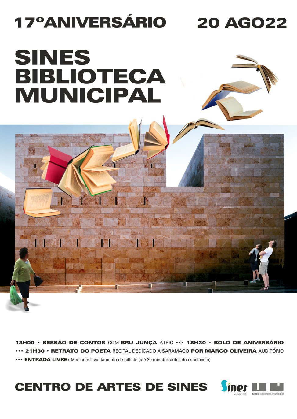 Às 18h30, sopram-se as velas dos 17 anos da Biblioteca Municipal, que ocupa a suas atuais instalações no Centro de Artes de Sines desde 2005.