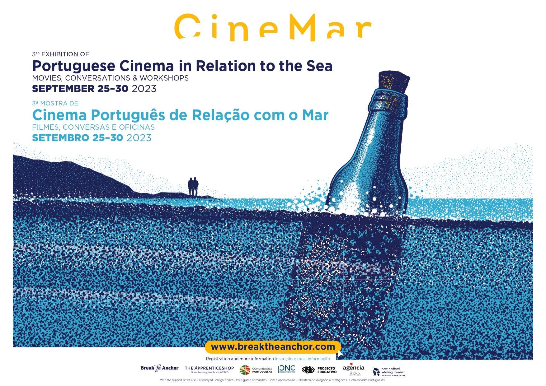 O projeto CineMar - Mostra de Cinema Português de Relação com o Mar – Filmes, Conversas & Oficinas, já realizada em 2021 e 2022, surgiu por ocasião das Comemorações do Dia Mundial do Mar, numa colaboração com a Cooperativa Break The Anchor, entidade sem fins lucrativos (EUA/ Portugal) e organizada em articulação com o Plano Nacional de Cinema. Este ano, o projeto conta mais uma vez com o apoio do Ministério dos Negócios Estrangeiros - Comunidades Portuguesas.