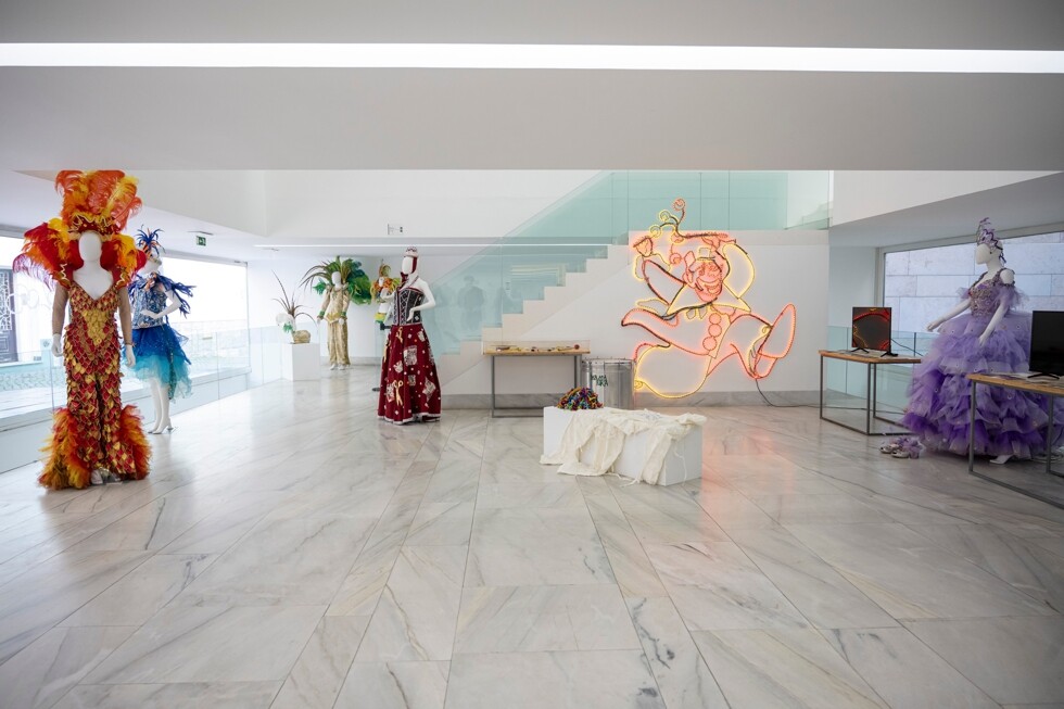 Patente no átrio e sala de periódicos, a mostra é composta por fatos, adereços e imagens que evocam escolas de samba, grupos foliões e grupos alegóricos, trazendo a cor e o espírito do evento para o interior do principal equipamento cultural do concelho.