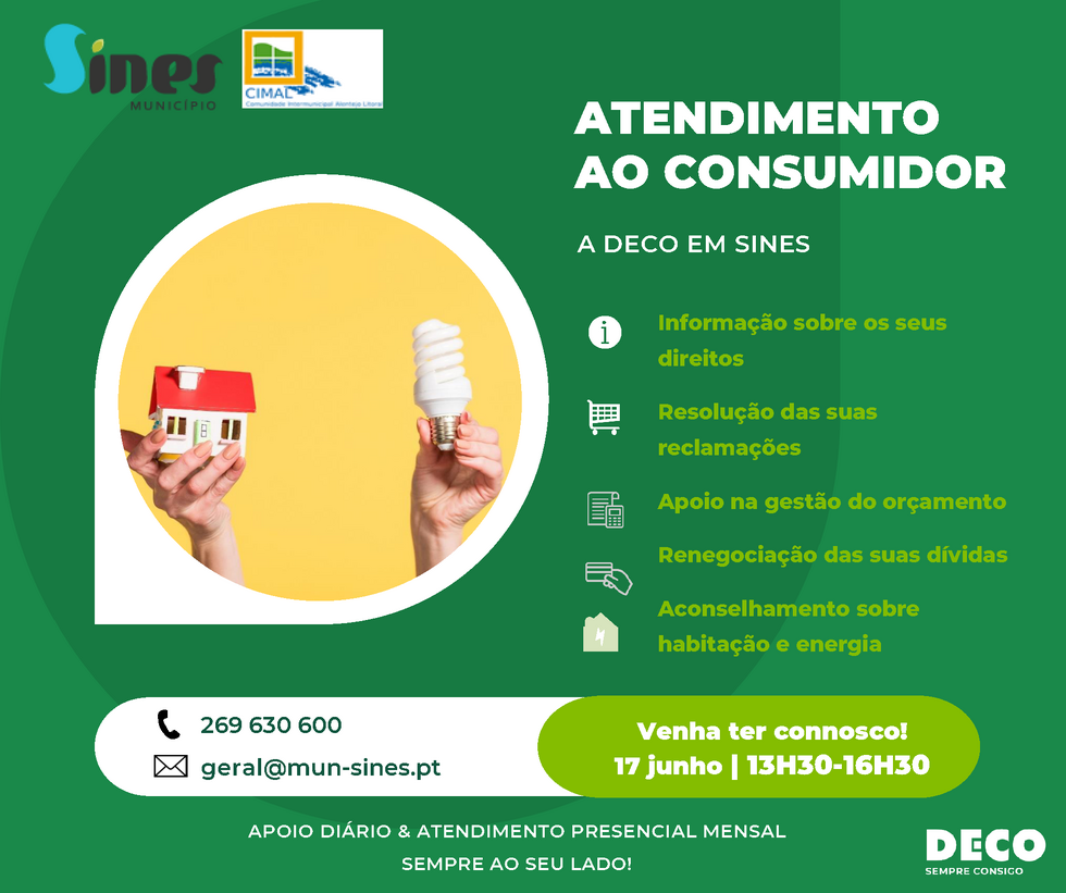 A Delegação de Évora da DECO faz, mensalmente, atendimento presencial aos consumidores do concelho de Sines. Com o atendimento, é possível obter: