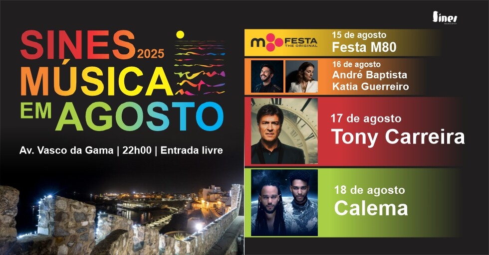 Na época tradicional das festas da cidade, Sines vive um agosto musical, com música popular de vários estilos, para vários gostos e para várias gerações.