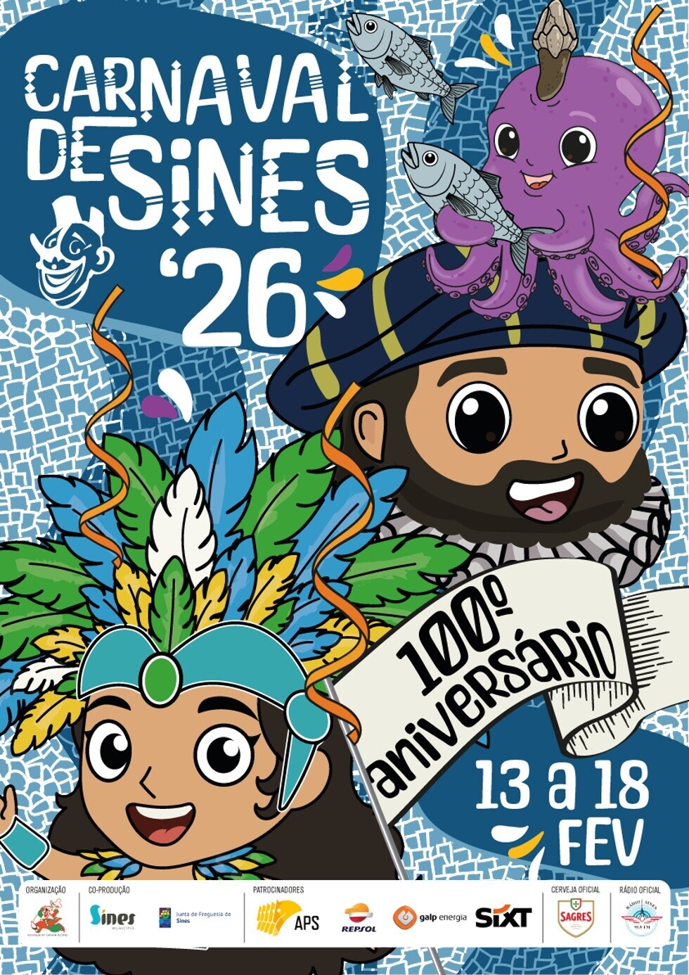 O Carnaval de Sines regressa de 13 a 18 de fevereiro de 2026, numa edição comemorativa dos 100 anos da maior festa popular da cidade.