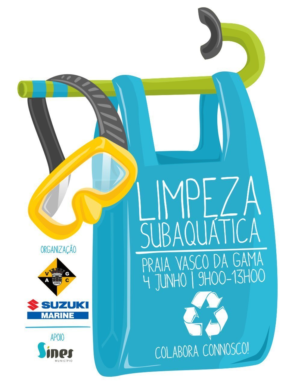Este domingo, 4 de junho, entre as 9h00 e as 13h00, realiza-se uma limpeza subaquática da baía de Sines, promovida pela secção de Pesca Submarina do Vasco da Gama, com o apoio da Câmara Municipal de Sines e patrocínio da Suzuki Marine.