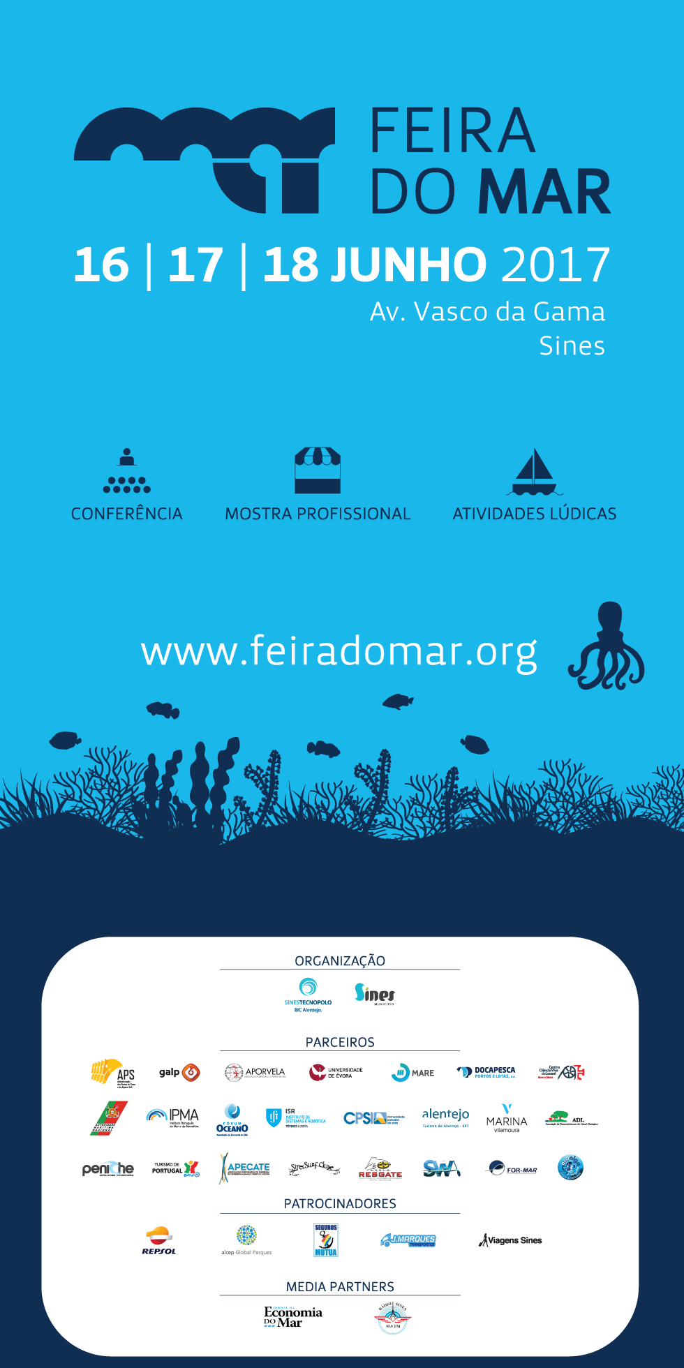 Nos dias 16, 17 e 18 de junho, o Sines Tecnopolo e a Câmara Municipal de Sines organizam a Feira do Mar 2017, um evento estratégico para a dinamização da economia do mar, enquanto espaço e tempo de partilha de experiências e de demonstração de projetos, de produtos e de atividades, mas também de divulgação do conhecimento e das oportunidades geradas por este setor junto dos jovens e da população em geral.