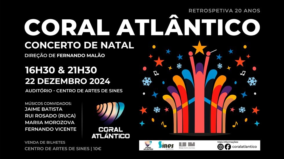 O Coral Atlântico volta ao Centro de Artes de Sines no dia 22 de dezembro, com o sempre esperado concerto de Natal, este ano com duas sessões, às 16h30 e 21h30.
