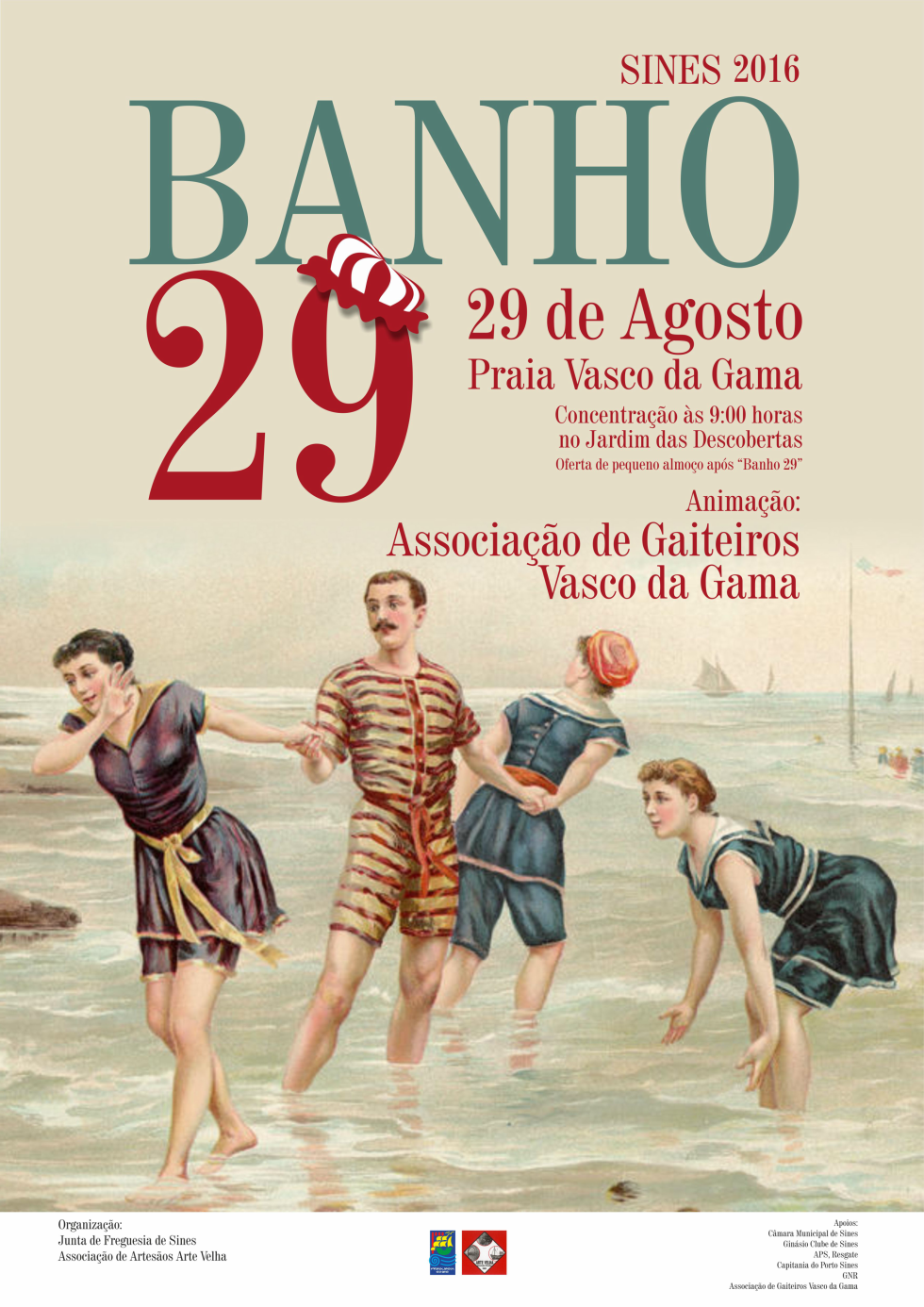 Adicionar a calendário2016-08-29 09:00:002016-08-29 13:00:00Europe/LisbonBanho 29Praia Vasco da GamaJunta de Freguesia de Sines e Associação de Artesãos Arte Velha. Apoio da Câmara Municipal de Sines
