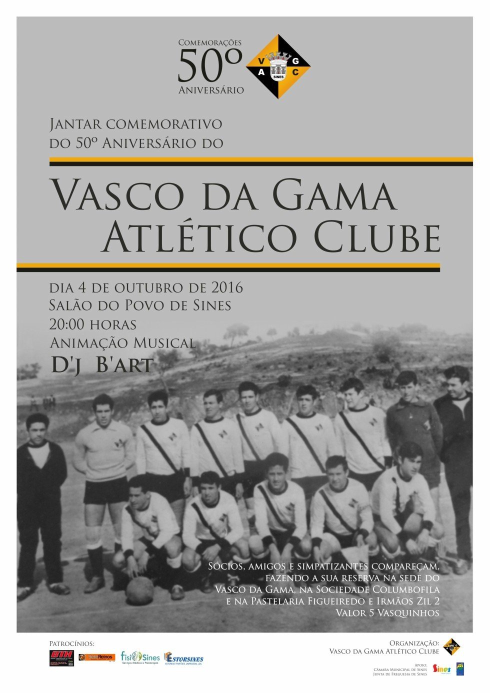 O Vasco da Gama Atlético Clube promove um jantar comemorativo do seu 50.º aniversário, no dia 4 de outubro, pelas 20h00, no Salão do Povo de Sines. O evento tem animação musical pelo Dj B´Art.