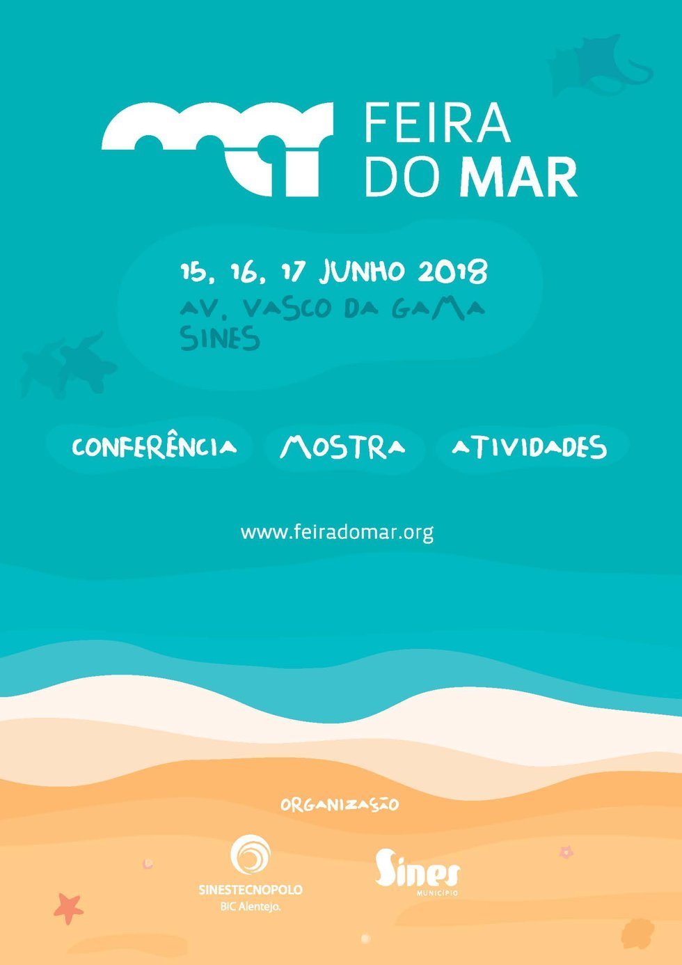 Evento estratégico para a dinamização da Economia do Mar, enquanto espaço e tempo de partilha de experiências e de demonstração dos projetos, dos produtos e das atividades, mas também de divulgação do conhecimento e das oportunidades geradas por este setor junto dos jovens e da população em geral. Inclui conferência “Inovar e Criar para Empreender na Economia do Mar”, mostra de expositores ligados ao setor do mar (na Avenida Vasco da Gama), e atividades lúdicas gratuitas (batismo de mergulho, Stand UP Paddle, visitas ao farol, passeio na embarcação da Estação Salva-vidas de Sines, zumba na praia, workshops de suporte básico de vida, atividades do Centro de Ciência Viva do Lousal, entre outras).