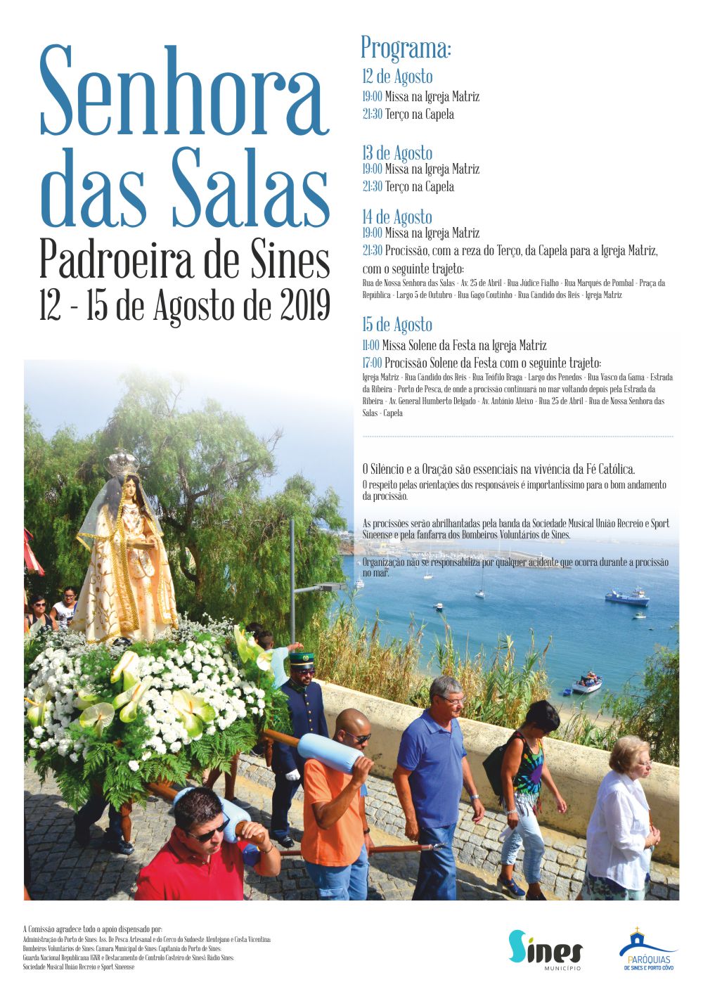De 12 a 15 de agosto, realizam-se as festas da padroeira dos pescadores de Sines, Nossa Senhora das Salas, com procissões pelo centro histórico (noturna, dia 14) e no mar (diurna, dia 15). Esta última, usando as traineiras dos pescadores, devidamente engalanadas, é o ponto alto das festividades.